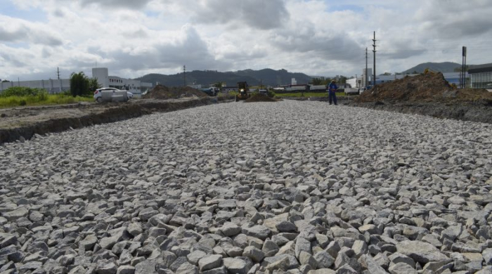 A terraplanagem está em andamento, com as primeiras camadas de pedra do tipo macadame e areia sendo aplicadas, juntamente com as caixas coletoras da rede de drenagem. Essas etapas indicam o prolongamento da rua e a localização da nova pista, que terá 10 metros de largura. Além disso, a obra inclui a construção de uma ciclovia e uma faixa de estacionamento.