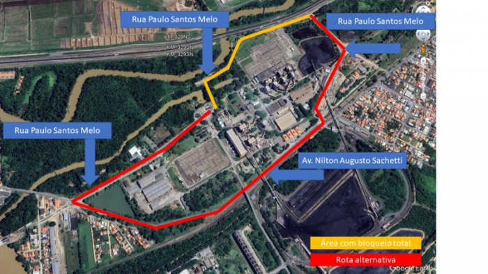 De acordo com a programação da Concessionária, o tráfego local, incluindo o de caminhões pesados será desviado para a avenida Nilton Augusto Sachetti, na rótula do bairro Santo André o trânsito será conduzido até a passagem de nível. Neste ponto os caminhões pesados dobrarão à esquerda, por onde seguirão até a BR-101 conforme ilustração.