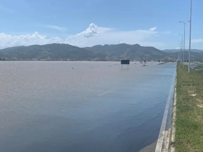 Parte de rodovia alagada em Tubarão após rompimento de dique — Foto: Defesa Civil/Divulgação