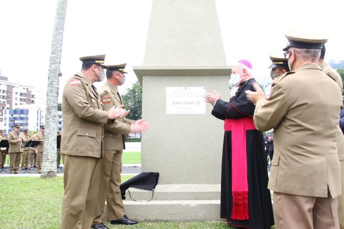 O arcebispo metropolitano da Arquidiocese de Florianópolis, Dom Wilson Tadeu Jönck, ressaltou a importância do monumento, pois foi aquele local onde São João Paulo II desceu e pisou pela primeira vez em Santa Catarina. Foto: PMSC A Polícia Militar de Santa Catarina realizou na manhã de sexta-feira, 15, na sede do Centro de Ensino da Polícia Militar de Santa Catarina, em Florianópolis, a inauguração do monumento em comemoração aos trinta anos da visita do Papa João Paulo II, realizada em 1991, a Santa Catarina.
