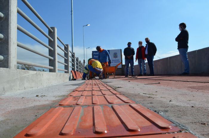 A empreiteira responsável pelas obras deu continuidade à colocação do piso podotátil e concretagem da ciclovia. Depois virá a sinalização horizontal nas pistas. Nos acessos à ponte os trabalhos seguem em ritmo acelerado, com construção das calçadas ao longo das duas ruas. Restam ainda a sinalização das vias e os acabamentos com gramado em alguns pontos próximos às cabeceiras.