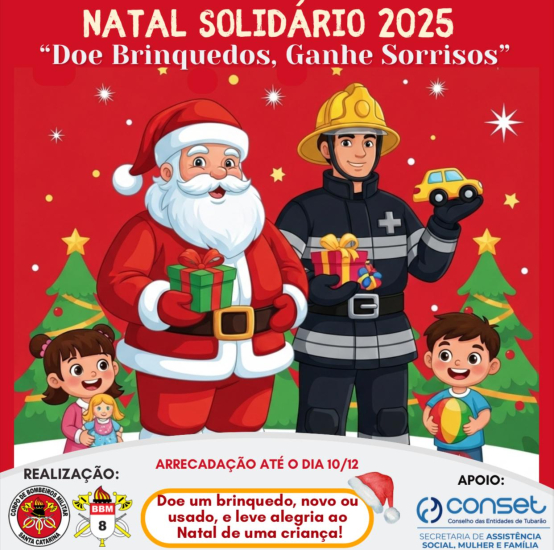 Divulgação/PMT A Prefeitura de Tubarão é parceira do Corpo de Bombeiros Militar na campanha “Natal Solidário 2025 – Doe Brinquedos, Ganhe Sorrisos”, uma ação que busca levar alegria e esperança às crianças em situação de vulnerabilidade do município neste fim de ano.
