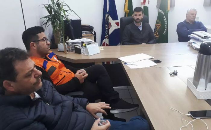 A reunião teve como objetivo organizar ações de assistência e suporte aos moradores da comunidade da Seri. Foto: PMG Na manhã desta sexta-feira, 06 de maio, o prefeito Clei Rodrigues e o vice-prefeito Jucemar Zanelato estiveram reunidos com a coordenação da Defesa Civil do Município de Gravatal e o secretariado.