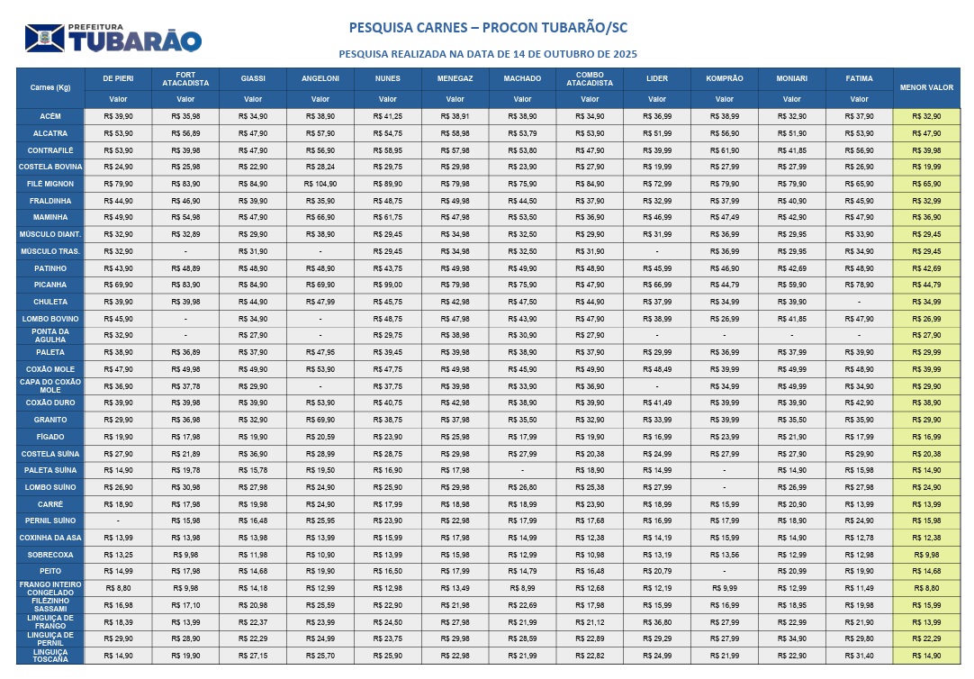 O Procon de Tubarão divulgou nesta terça-feira (14) a pesquisa comparativa de preços das carnes referente ao mês de outubro. O levantamento foi realizado nos principais supermercados do município e apontou variações expressivas nos valores de cortes bovinos, suínos e de frango.