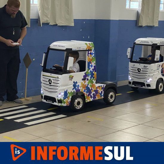 Nas aulas, os alunos participam de um simulador e são conduzidos, através de controle remoto, pelas ruas de uma cidade fictícia. Foto: PMI A Prefeitura de Imbituba, através da Secretaria de Educação, Cultura e Esporte (SEDUCE), iniciou, nas escolas de ensino fundamental do município, o projeto “Mini Caminhão Elétrico Infantil”. As aulas, em parceria com a empresa G7 Log, são gratuitas e buscam ensinar as crianças, de 03 a 07 anos, sobre as leis de trânsito.