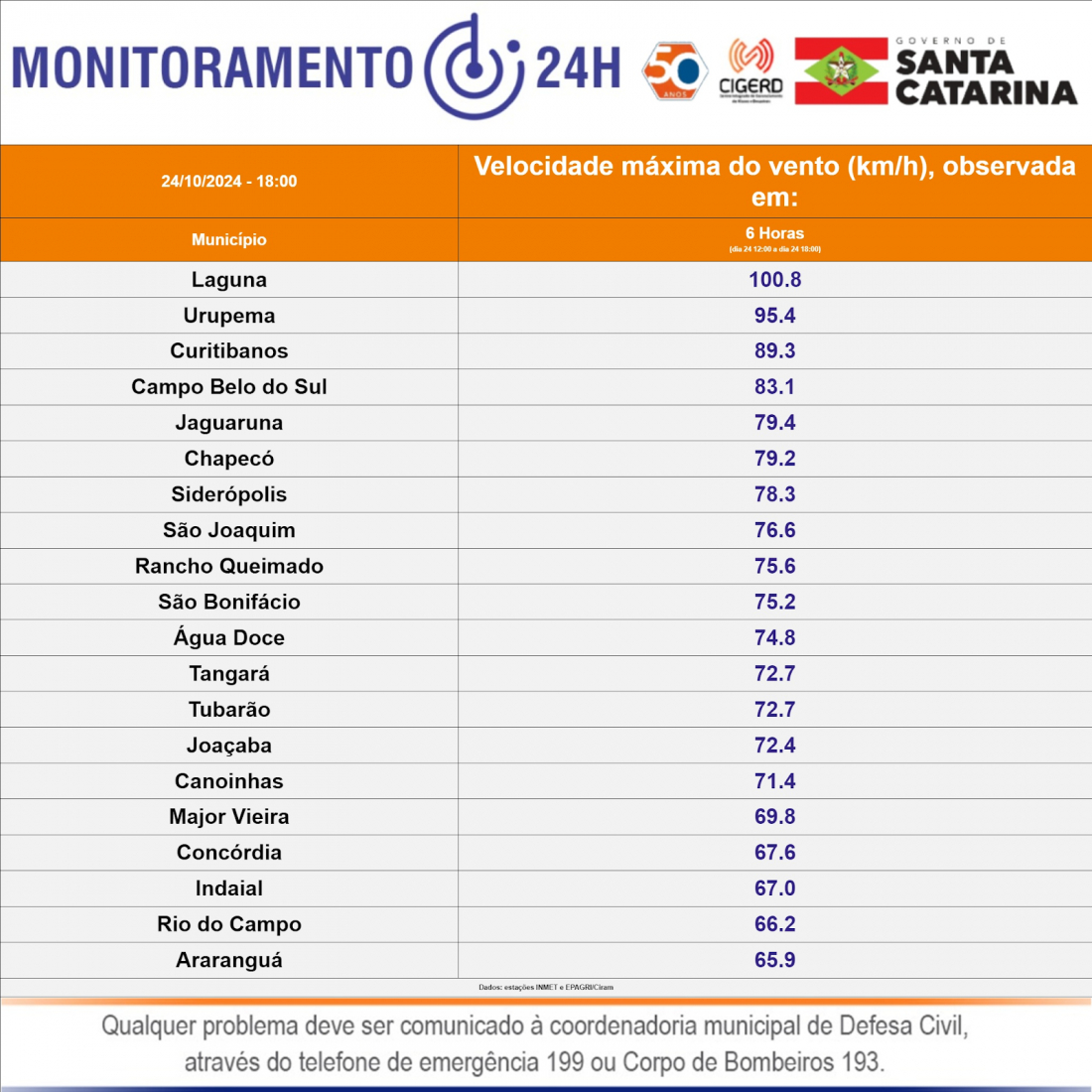 Nesta quinta-feira (24), Laguna registrou ventos de mais de 100 km/h, conforme relatório da Defesa Civil, tornando-se o maior índice entre as ocorrências do estado. Os ventos intensos, acompanhados de chuva e granizo, causaram uma série de transtornos, incluindo destelhamentos, quedas de árvores e interrupções no fornecimento de energia elétrica.