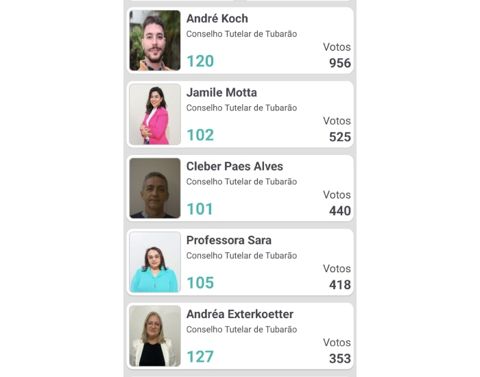 Os cinco candidatos mais votados, que agora compõem o Conselho Tutelar de Tubarão, são: