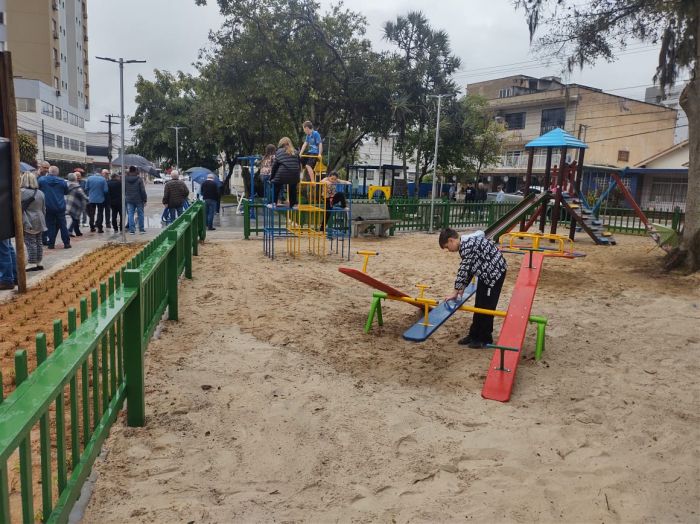 O investimento foi de aproximadamente R$ 252 mil. Foto: Priscila Loch Mesmo com a chuva persistente, a revitalização da Praça General Osvaldo Pinto da Veiga, em Tubarão, foi entregue oficialmente nesta quinta-feira (15), feriado municipal em homenagem à padroeira Nossa Senhora da Piedade. Além de autoridades, diversos moradores da comunidade compareceram.