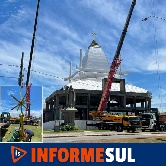 Na manhã desta segunda-feira, dia 17, a “estrela do sul”, que representa a cidade de Tubarão, foi colocada no ponto mais alto da estrutura. Além da estrela, os pináculos também serão erguidos ainda hoje.