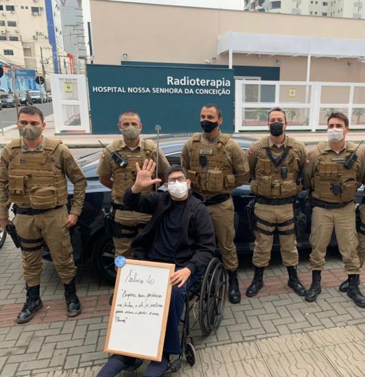 O policial militar, que já é da reserva remunerada agradeceu a homenagem dos colegas de farda. Foto: Divulgação/PM Ontem familiares, colegas de farda e equipe médica do Hospital Nossa Senhora da Conceição celebraram a recuperação do Sargento da Reserva Remunerada da Polícia Militar de Santa Catarina, Hilton Gondo Urbano, de 50 anos. O policial contraiu a Covid-19 e, após 3 meses internado recebeu alta hospitalar.