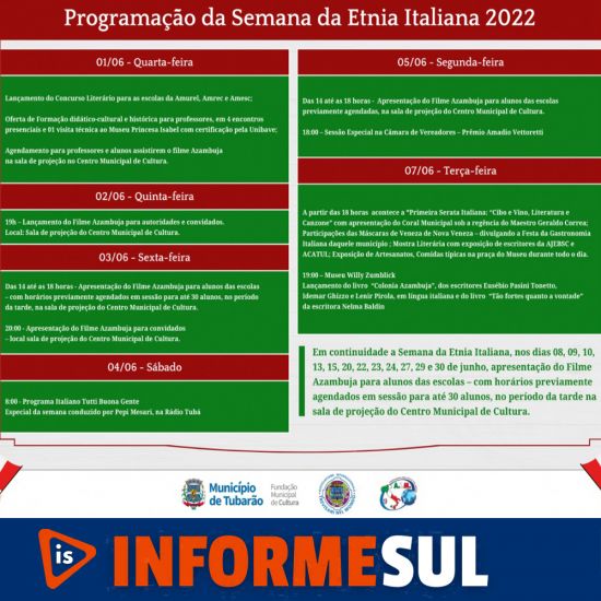 A programação é extensa e inicia nesta quinta-feira, dia 2. Entre as atividades haverá uma homenagem na Câmara de Vereadores. Foto: Arte/Decom/PMT Em uma parceria entre a Fundação Municipal de Cultura, a Secretaria Nacional da AIM no Brasil o Comitato Dante Alighieri de Tubarão e Região (Codatur) e a Associação Internazionale Trevisani nel Mondo (AITM) – ocorre entre até a próxima terça-feira (7) a Semana da Etnia Italiana, em Tubarão.