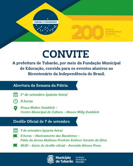 Na quarta-feira (7), os eventos em comemoração ao Dia da Independência do Brasil iniciam às 8 horas, com hasteamento das bandeiras, no pátio da Arena Multiuso Prefeito Estêner Soratto da Silva. Após o hasteamento, o prefeito Joares Ponticelli e o comandante da 3ª Companhia de Infantaria Motorizada, Capitão Fernando Fracalossi Schramm passarão a tropa em revista, dando início ao desfile que será aberto pela 3ª Companhia de Infantaria Motorizada – Exército de Tubarão.