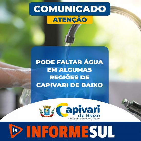 Informamos que em virtude das cheias ocorridas nesta semana na região, o sistema de captação, tratamento e abastecimento de água entrou em colapso em alguns pontos de Tubarão e Capivari de Baixo. Em nosso município, a distribuição no bairro Ilhotinha, por exemplo, precisou ser interrompida, mas logo voltará à normalidade. É importante que os moradores fechem os registros.