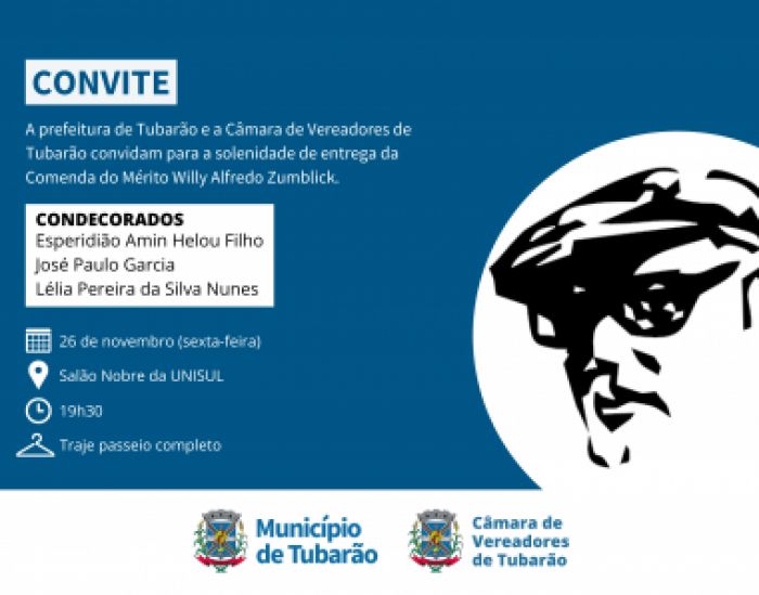 O ato de entrega da honraria terá, ainda, apresentações artísticas do Coral Municipal de Tubarão e do grupo de teatro Entrepalcos, além da presença de convidados e de autoridades. Segundo a Lei que instituiu a homenagem, o cerimonial de entrega da Comenda Municipal do Mérito Willy Alfredo Zumblick deve ter a presença de um membro da família Zumblick, que ficará em local de destaque durante o evento.