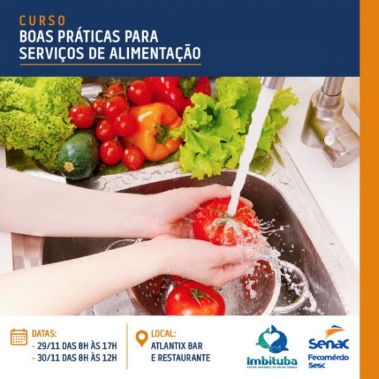 O curso de Boas Práticas para os Serviços de Alimentação está marcado para acontecer entre os dias 29/11 (das 08 às 17 horas) e 30/11 (das 08 ao meio-dia), no restaurante Atlantix, no Centro. Foto: Divulgação A Secretaria de Desenvolvimento Econômico, Turístico e Portuário (SEDETUR) e o Serviço Nacional de Aprendizagem Comercial (SENAC) seguem com inscrições abertas para três cursos, gratuitos, para quem trabalha nas áreas de turismo em Imbituba: