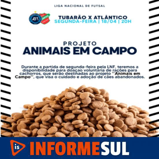 Durante o duelo entre Tubarão Futsal e Atlântico de Erechim (RS), o clube promoverá o projeto “Animais em campo”, que buscará a promoção do bem-estar animal e da adoção responsável.