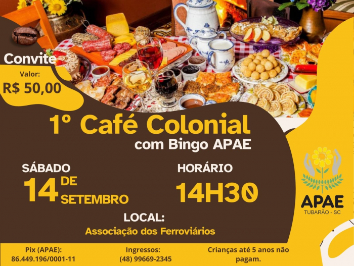 A APAE de Tubarão realizará um café beneficente no dia 14 de setembro, a partir das 14h30, no Salão dos Ferroviários, localizado no bairro Oficinas. O evento tem como objetivo arrecadar fundos para apoiar as atividades e serviços prestados pela instituição.