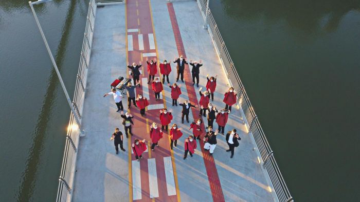 Devido a gravação, a passarela ficou interditada por algumas horas e foi liberada no fim das apresentações. Foto: Divulgação A passarela Ângelo Zaboti em Tubarão serviu de palco para a gravação de um vídeo do Coral Municipal da cidade. A iniciativa da Fundação Municipal de Cultura é por ocasião do aniversário de 151 anos do município, que será celebrado no próximo dia 27. Os coralistas, comandados pelo maestro Geraldo Corrêa, cantaram cinco músicas, entre elas o hino da cidade.
