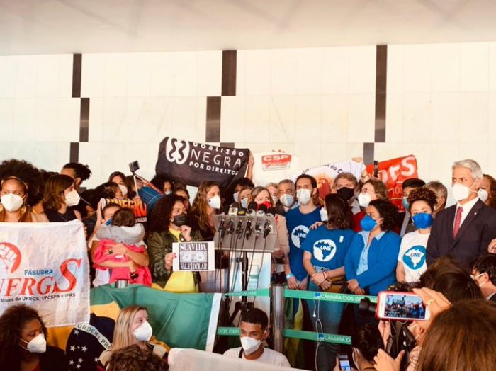 Partidos políticos, parlamentares, movimentos sociais e entidades da sociedade civil protocolaram o pedido. Foto: UNE Partidos políticos, parlamentares, movimentos sociais e entidades da sociedade civil protocolaram nesta quarta-feira (30) na Câmara o chamado "superpedido" de impeachment do presidente Jair Bolsonaro.