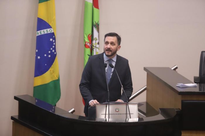 Pepê citou diversas obras necessárias pelo desenvolvimento já em execução e também projetos que necessitam de atenção especial para poder sair do papel. Foto: Luiz Prudêncio O tubaronense Pepê Collaço (Progressistas) assumiu uma cadeira na Assembleia Legislativa nesta terça-feira (5). A posse foi bastante prestigiada, com a presença de muitas autoridades e lideranças de várias regiões do Estado, principalmente do Sul.