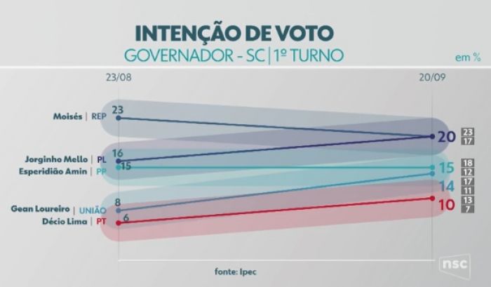 Foram ouvidas 800 pessoas entre os dias 17 e 19 de setembro em municípios catarinenses. Foto: Reprodução Pesquisa do Ipec (ex-Ibope) divulgada nesta terça-feira (20) pela NSC Comunicação revela os índices de intenção de voto para o cargo de governador de Santa Catarina. Os candidatos Joraginho Mello (PL) e Carlos Moisés (Republicanos) estão empatados com 20% das intenções de voto.