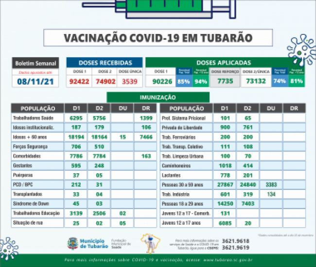Tubarão vacinou com a primeira dose 85% da população total e 94% da população vacinável (12 anos ou mais). Foto: Divulgação O boletim da vacinação contra a Covid-19, realizado pela coordenação de Imunização, da Fundação Municipal de Saúde (FMS), foi divulgado ontem. Até o momento, Tubarão vacinou com a primeira dose 85% da população total e 94% da população vacinável (12 anos ou mais). Já com a segunda dose do imunizante, ou dose única, foram imunizadas 74% da população total e 81% da população vacinável.