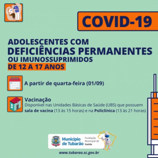 Pessoas com mais de 18 anos que se enquadram nestes mesmos critérios poderão receber uma dose de reforço do imunizante. Foto: Divulgação Mais uma fase da vacinação contra a Covid-19 iniciará amanhã em Tubarão. Desta vez, adolescentes de 12 a 17 anos que se enquadram nos critérios de imunossupressão e que possuem deficiências permanentes poderão receber o imunizante. Pessoas com mais de 18 anos que se enquadram nestes mesmos critérios poderão receber uma dose de reforço do imunizante. A campanha acontecerá nas Unidades Básicas de Saúde (UBS) que possuem salas de vacina (clique aqui) e na sala central da Policlínica, das 13 às 21 horas.