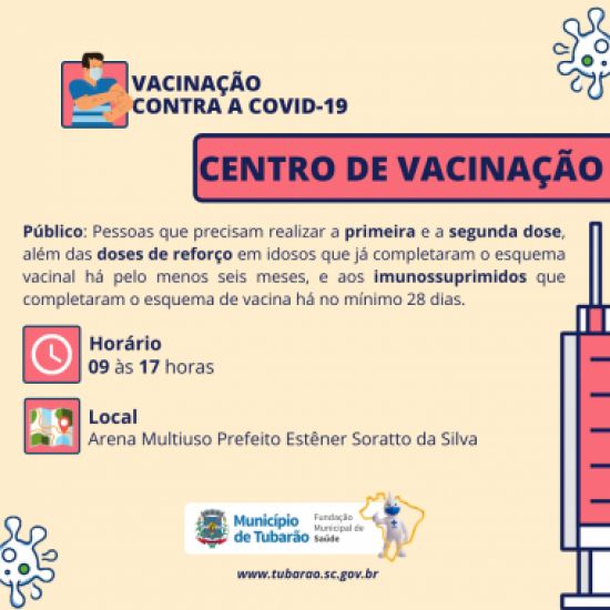 No local, serão realizadas as aplicações de vacinas de primeira e segunda dose, além da aplicação das doses de reforço aos idosos que já completaram o esquema vacinal há pelo menos seis meses, e aos imunossuprimidos que completaram o esquema de vacinação há no mínimo 28 dias.