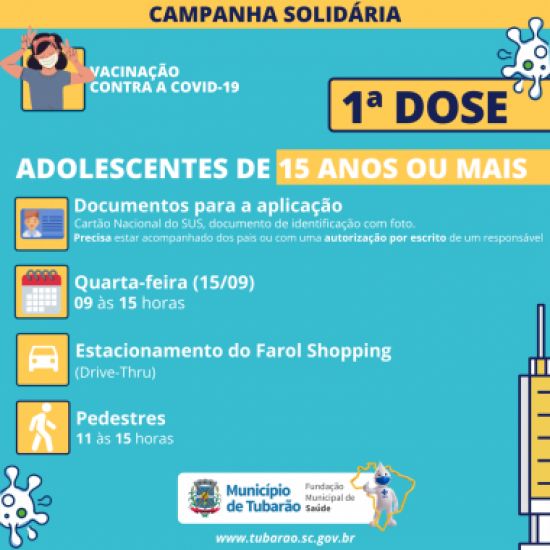 A campanha será das 9 às 15 horas em sistema drive-thru, e para os pedestres, das 11 às 15 horas. Foto: Divulgação Mais uma etapa da campanha de vacinação contra a Covid-19 ocorre amanhã, feriado municipal. Desta vez, adolescentes com 15, 16 e 17 anos poderão receber o imunizante no estacionamento do Farol Shopping. A campanha será das 9 às 15 horas em sistema drive-thru, e para os pedestres, das 11 às 15 horas.