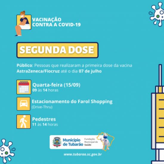 A campanha, que acontecerá em sistema drive-thru das 9 às 14 horas, com horário diferenciado para pedestres, das 11 às 14 horas. Foto: Divulgação O estacionamento do Farol Shopping sediará mais uma campanha de vacinação de segunda dose, na próxima quarta-feira, dia 15, feriado municipal. Desta vez, as pessoas que receberam a primeira dose do imunizante do laboratório AstraZeneca/Fiocruz até o dia 7 de julho poderão se vacinar.