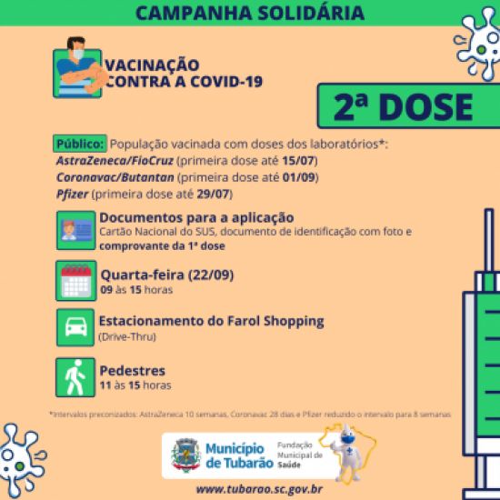 Em Tubarão a vacinação será em sistema drive-thru, das 09 às 15 horas, com horário diferenciado para pedestres, das 11 às 15 horas. Foto: Divulgação O estacionamento do Farol Shopping sediará mais uma campanha de vacinação de segunda dose e de dose de reforço, na próxima quarta-feira (22), em sistema drive-thru, das 09 às 15 horas, com horário diferenciado para pedestres, das 11 às 15 horas.