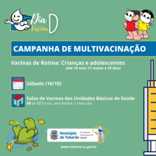 A campanha é direcionada às crianças e aos adolescentes com até 15 anos incompletos (14 anos, 11 meses e 29 dias) para que possam completar a caderneta de vacinação. Foto: Divulgação O Dia D da Campanha Nacional de Multivacinação acontece sábado que vem, dia 16, e as Unidades Básicas de Saúde (UBS) com sala de vacinação, estarão abertas das 08 às 17 horas, sem fechar ao meio dia.