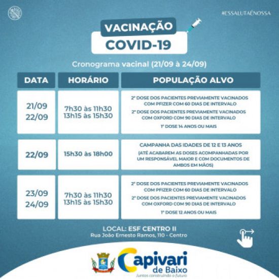 A Secretaria de Saúde vai imunizar com a primeira dose da Pfizer os adolescentes de 12 e 13 anos amanhã, na ESF Centro II, na rua João Ernesto Ramos, 110, das 15h30 às 18h. Nesta terça (21) e quarta (22), das 7h30 às 11h30 e das 13h15 às 15h30, também ocorre a segunda aplicação aos pacientes previamente vacinados com Pfizer com 60 dias de intervalo, e aos imunizados com Oxford com 90 dias de intervalo, além da repescagem de primeira dose aos capivarienses com 14 anos ou mais. Nos mesmos horários e local, na quinta (23) e sexta (24), o público citado será vacinado, então com a inclusão de repescagem aos moradores de 12 anos ou mais.