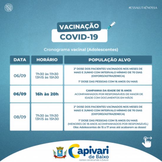 Até o momento, a Agência Nacional de Vigilância Sanitária (Anvisa) não autorizou a aplicação de nenhuma vacina contra a Covid-19 em crianças. Foto: Divulgação Contagem regressiva para que Capivari de Baixo conclua seu esquema vacinal contra a Covid-19 - ao menos com a aplicação da primeira dose - na população apta pelos laboratórios e Anvisa neste ano. A partir de hoje faltarão somente os adolescentes de 12, 13 e 14 anos, já que os adolescentes de 15 poderão se imunizar nesta segunda-feira, das 16 às 20 horas, na ESF Centro II, na rua João Ernesto Ramos, 110.