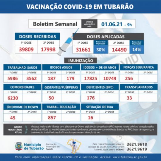 O maior índice de vacinados são idosos, os residentes de asilos (187) e de 60 anos ou mais (17.825). Foto: Arte/PMT Nesta terça-feira, o boletim atualizado da vacinação contra a Covid-19, da coordenação de Imunização da Fundação Municipal de Saúde (FMS) de Tubarão, foi divulgado. No total, 30% da população tubaronense está imunizada com a primeira dose da vacina (39.809), e 14% já recebeu também a segunda dose (17.998).