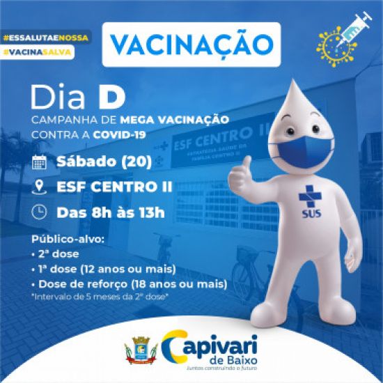 Além deste público-alvo, o Dia D também será destinado à vacinação da primeira dose aos moradores de 12 anos ou mais (adolescente somente acompanhado por adulto responsável); e dose de reforço aos capivarienses de 18 anos ou mais - com intervalo de cinco meses da segunda aplicação.