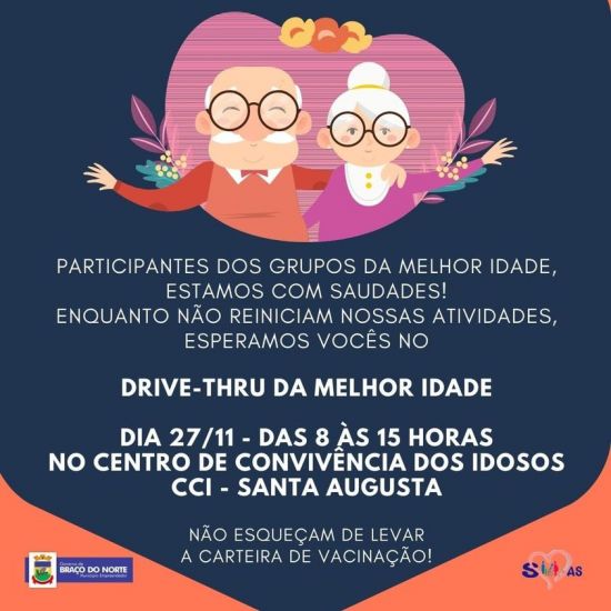 Serão entregues cartilhas sobre cuidados com a saúde em tempos de pandemia e dadas as orientações para o retorno dos encontros, que devem acontecer após fevereiro de 2022. Foto: Divulgação A Secretaria de Assistência Social de Braço do Norte realiza neste sábado, dia 27, o Drive da Melhor Idade, uma forma de interagir com os quase mil idosos que estão cadastrados nos Grupos da Melhor Idade do Município.