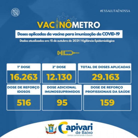 De acordo com dados do boletim semanal do ‘vacinômetro’, divulgados na última sexta-feira (15), pela Vigilância Epidemiológica capivariense, são 12.130 pacientes que já receberam duas aplicações, além de 516 idosos imunizados com o reforço, mais 159 trabalhadores da saúde, também com dose de reforço, e, fechando, 95 moradores imunossuprimidos com a dose adicional, somando, portanto, um total de 29.163 doses.