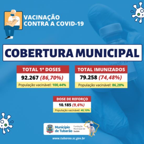 As vacinas estão sendo aplicadas nas Unidades Básicas de Saúde (UBS) perante agendamento prévio, na sala central da Policlínica das 08 às 21 horas ou também no Centro de Vacinação implantado na Arena Multiuso Prefeito Estêner Soratto da Silva, das 09 às 1 O boletim da vacinação contra a Covid-19, realizado semanalmente pela coordenação de Imunização, da Fundação Municipal de Saúde (FMS), foi divulgado nesta segunda-feira (29). Com a primeira dose, foram vacinadas 100,44% da população vacinável, e 86,70% da população total. Já com a segunda dose foram imunizadas 86,28% da população vacinável, e 74,48% da população total.