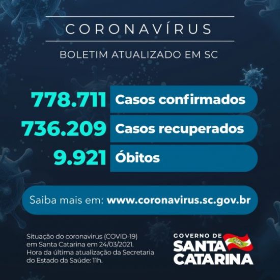 Boletim publicado hoje (24), pelo governo de SC. Foto: Governo de Santa Catarina O Governo de Santa Catarina informou que há 778.711 pacientes com confirmação de infecção pelo novo coronavírus, dos quais 736.209 estão recuperados e 32.581 permanecem em acompanhamento. O número foi divulgado nesta quarta-feira, 24. A doença respiratória causou 9.921 óbitos no estado desde o início da pandemia. Esses números colocam a taxa de letalidade em 1,27%.