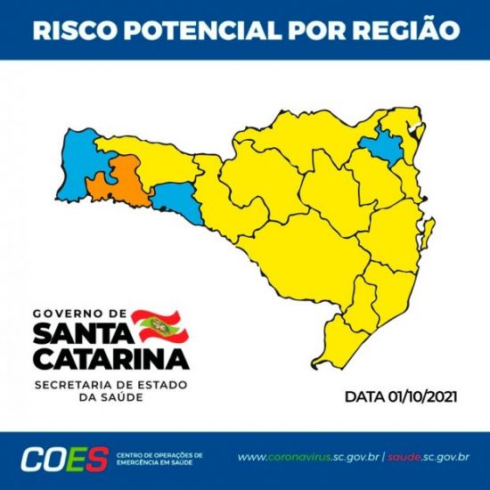 As regiões em risco alto são Alto Vale do Itajaí, Alto Vale do Rio do Peixe, Carbonífera, Extremo Sul, Foz do Rio Itajaí, Grande Florianópolis, Laguna, Médio Vale do Itajaí, Meio Oeste, Nordeste, Planalto Norte, Serra e Xanxerê.