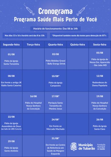 Vale lembrar, que as campanhas de vacinação do município também acontecem nas Unidades Básicas de Saúde (UBS), perante agendamento; na Policlínica Central (de segunda a sexta-feira, das 8 às 21h30) e no Centro de Vacinação da Arena Multiuso (segunda a sexta-feira, das 13 às 18h30).