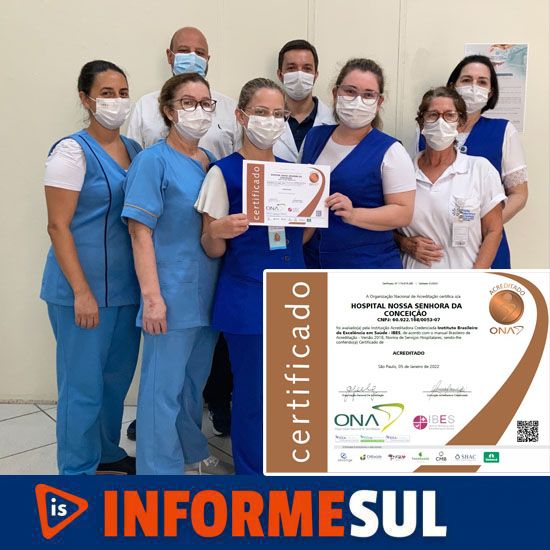 Legenda da foto: A avaliação verificou evidências de conformidade nas diversas áreas, envolvendo todos os colaboradores do HNSC O Hospital Nossa Senhora da Conceição, de Tubarão, referência em alta complexidade, recebeu no final de 2021 a Certificação de Acreditação ONA Nível 1, que avalia a segurança do paciente e a qualidade da assistência prestada.