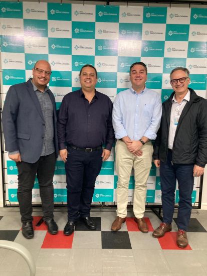 O Diretor Técnico Eduardo Ali, Dr. Jaime, Dr. Leonardo e o Diretor Executivo Fabio Teixeira. Foto: HNSC Tomou posse ontem, 26, em cerimônia no auditório do Hospital Nossa Senhora da Conceição, de Tubarão, a nova direção clínica da instituição, formada pelo cirurgião cardíaco Dr. Jaime da Motta Corrêa Júnior, e pelo vice-diretor, o médico pneumologista Lars Thales Escobar.