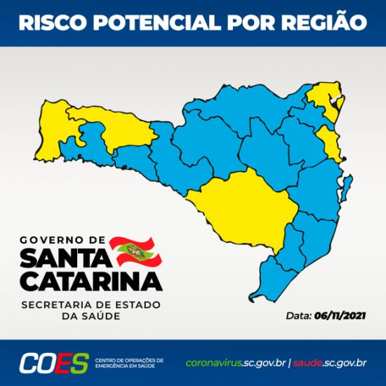 Houve melhora nos indicadores das regiões do Alto Uruguai Catarinense, Médio Vale do Itajaí, Oeste e Planalto Norte, que na semana anterior estavam classificadas como nível alto (amarelo), e passaram a ser classificadas como risco moderado. Ela se juntam, agora, as regiões do Alto Vale do Itajaí, Alto Vale do Rio do Peixe, Carbonífera, Extremo Sul, Grande Florianópolis, Laguna, Meio Oeste e Vale do Itapocu no nível azul.