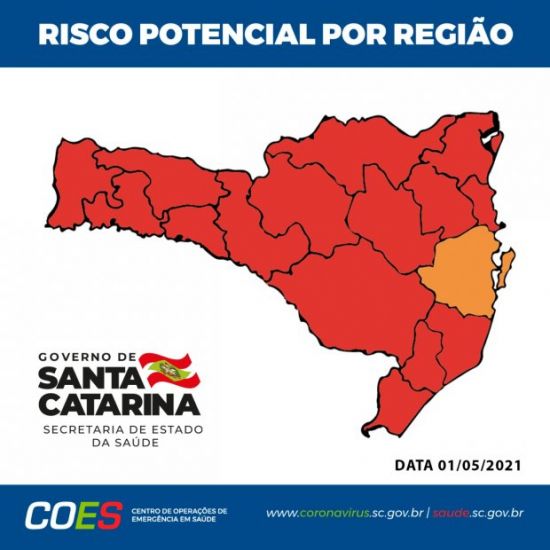As regiões do Alto Uruguai Catarinense, Meio-Oeste e Planalto Norte são as que se encontram no nível mais crítico. Foto: Arte de divulgação SC A Matriz de Risco Potencial divulgada neste sábado, 1° de maio, aponta que apenas a região da Grande Florianópolis se manteve no patamar grave (cor laranja) para a transmissão da Covid-19. Todas as outras 15 regiões foram classificadas em nível gravíssimo (cor vermelha).