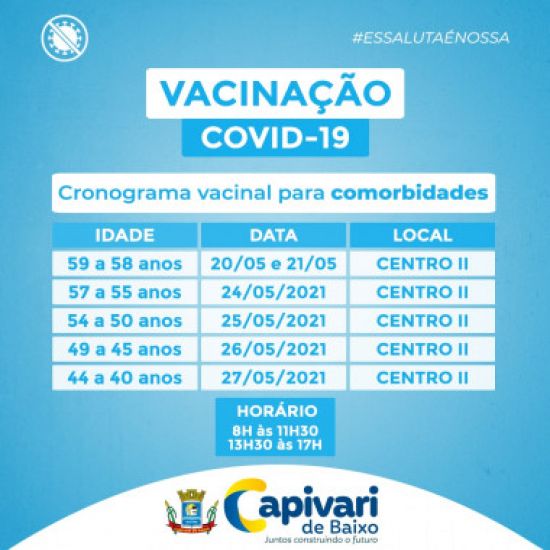 O paciente terá que assinar uma declaração de veracidade das informações e autenticidades dos documentos apresentados. Foto: Arte de divulgação A vacinação contra a covid-19 do grupo de comorbidades em Capivari de Baixo inicia amanhã e vai até o dia 27. A próxima fase será para quem tem 58 e 59 anos, na Estratégia Saúde da Família (ESF) Centro II, na rua João Ernesto Ramos, ao lado da Rádio 102 (referência), no Centro, das 8 às 11h30min, e das 13h30min às 17 horas.