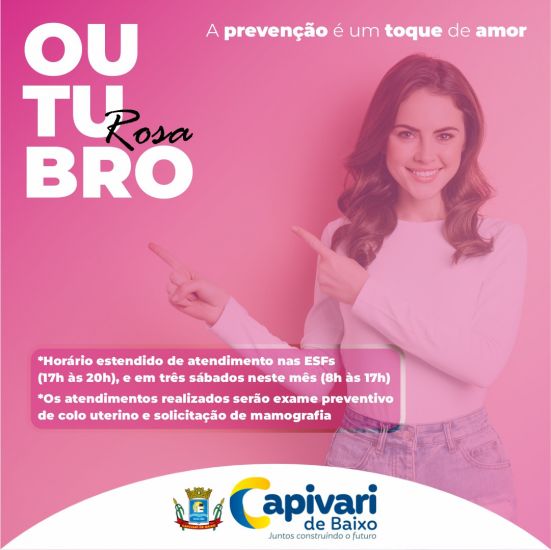 Os postos terão horário estendido das 17h às 20h, por duas semanas seguidas (conforme cronograma da tabela abaixo), já iniciando nesta segunda-feira (3), na ESF Otto e, na terça (4), na ESF Vila Flor. Foto: PMCB Todas as Estratégias de Saúde da Família (ESFs) de Capivari de Baixo terão horário especial de atendimento às mulheres em mais uma campanha especial do Outubro Rosa.