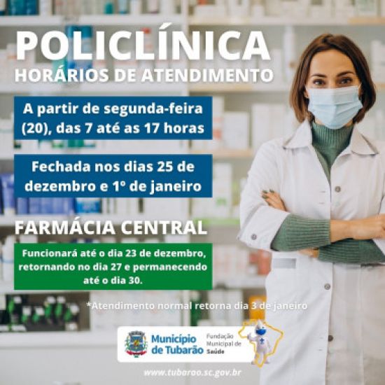 Destaca-se, que o funcionamento da farmácia central também terá alterações. A mesma, funcionará até o dia 23 deste mês, retornando no dia 27 e permanecendo até o dia 30. Após, o serviço volta a funcionar no dia 3 de janeiro.