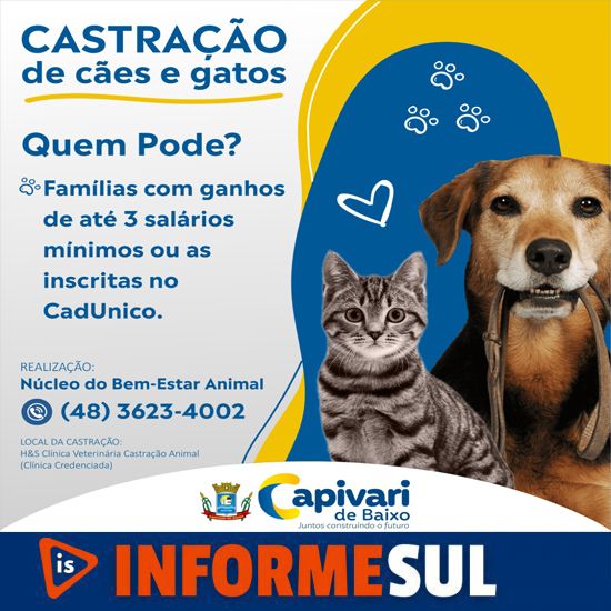 O procedimento é gratuito ao dono ou tutor do animal e é executado por uma clinica credenciada que funciona na rua Laguna, bairro Oficinas, em Tubarão. As famílias de rentabilidade de até três salários mínimos e as inscritas no CadÚnico ou no Bolsa-Família podem solicitar.
